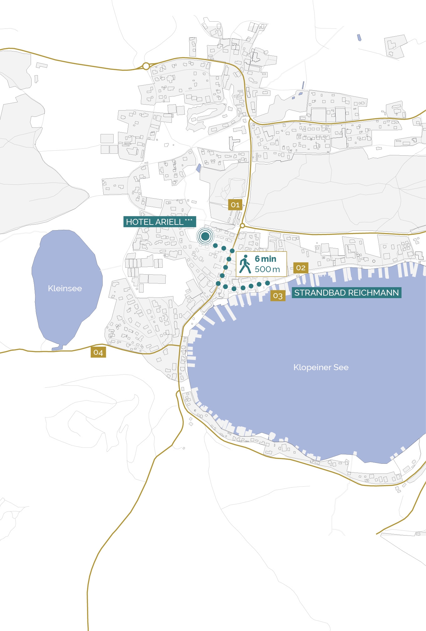 Das Hotel befindet sich in einer Bestlage inmitten der Tourismusregion St. Kanzian, nur 270 Meter Luftlinie vom Klopeiner See entfernt. Der nächste öffentliche Seezugang ist durch einen kurzen Spaziergang über die sehenswerte Promenade des Klopeiner Sees vom Hotel aus erreichbar. Kooperationen mit den zahlreichen öffentlichen Strandbädern bezüglich einer günstigen Mitbenützung für Hotelgäste sind jederzeit möglich. Viele beliebte Sehenswürdigkeiten der Region sind aufgrund der zentralen Lage nahe.